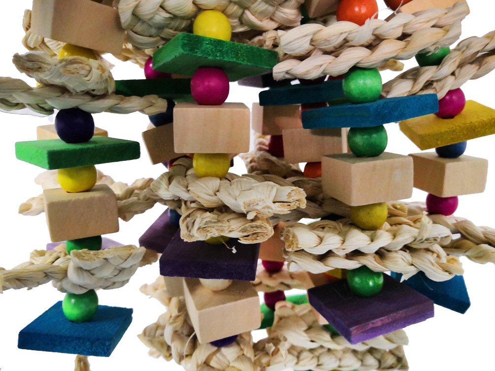 Parrots Gnaw On Toys Made Of Corn Husk And Wood